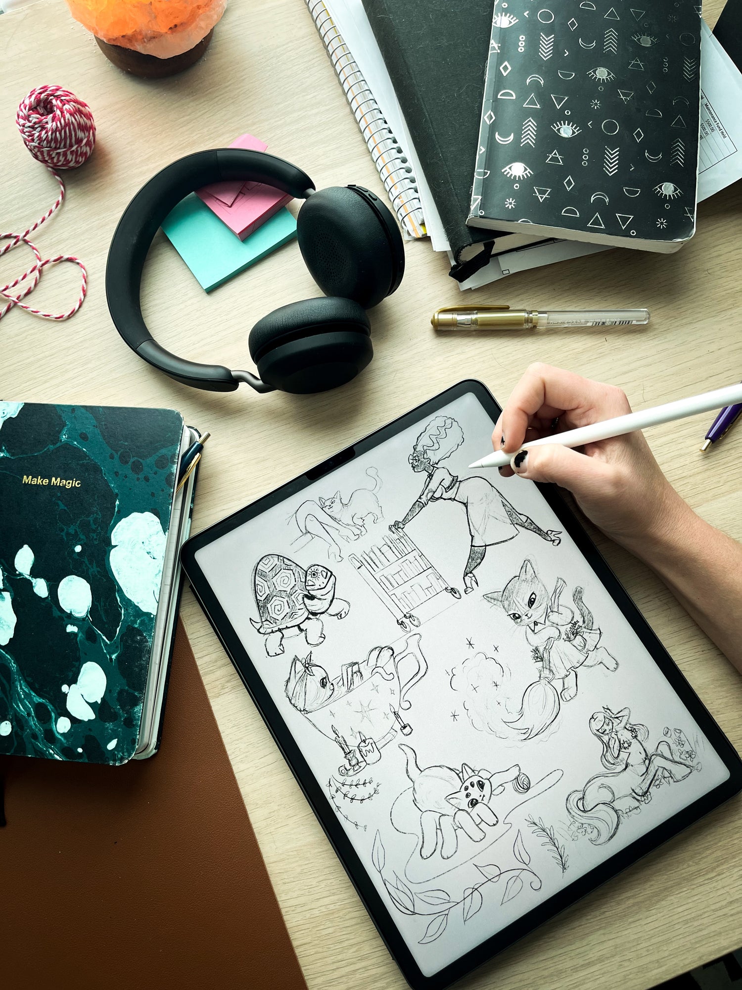 Most of my inspiration grows from fantasy, folklore, nature and magick. I spent most of my teens and 20s painting traditionally in watercolor or acrylic on canvas. Now, I create my art digitally, using traditional illustration techniques and analog-feeling brushes and textures -- technology has come such a long way to make digital painting feel like traditional. All of my work is still hand-drawn and painted (by me, a real human goblin), and I use the same basic process I would with paint-on-paper. I'm simply pushing around pixels instead of paint.