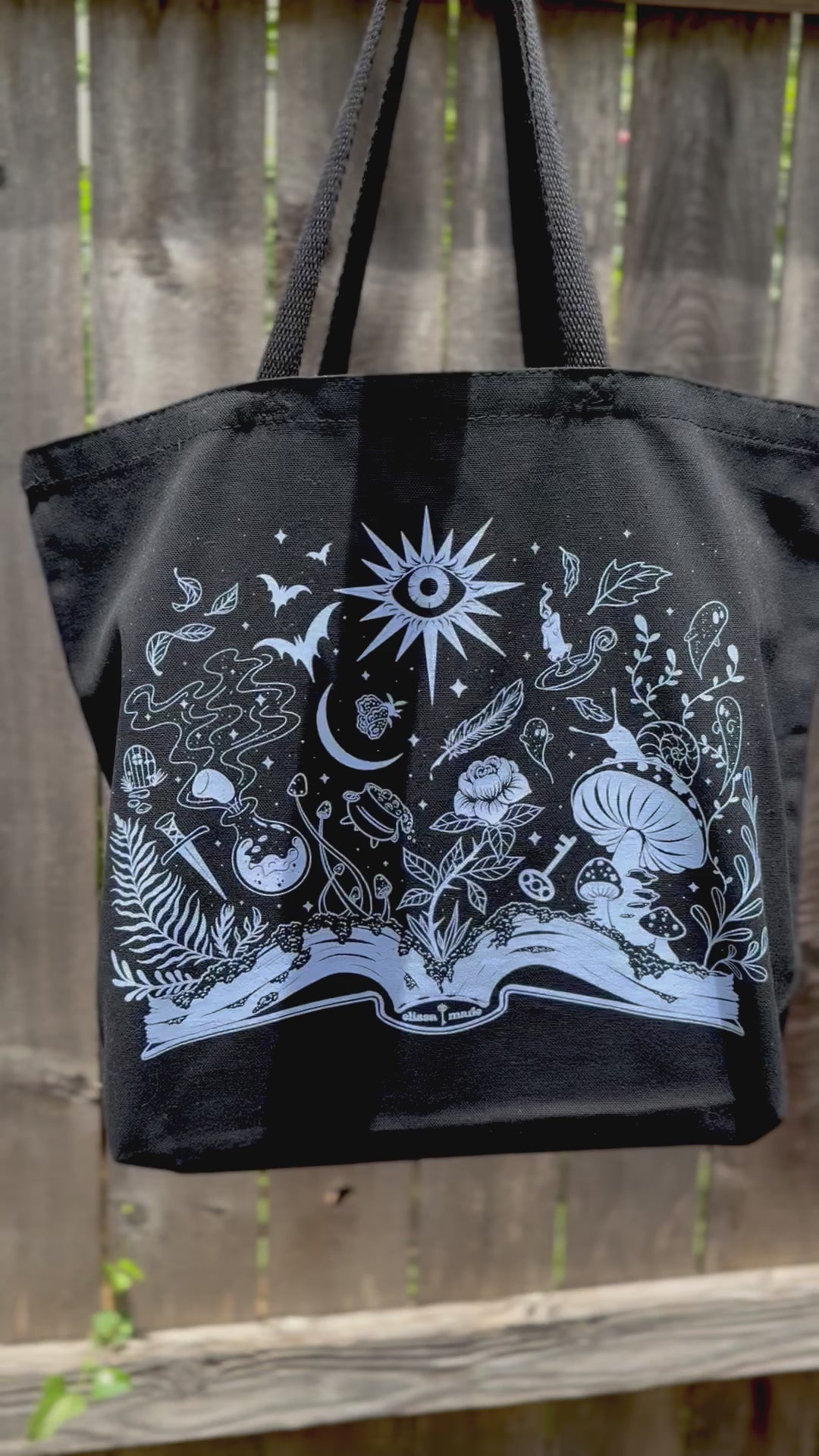 Slay your summer reading list in style with my Books Are Magic Large Tote Bag! Perfect for carrying your pool essentials, beach reads, or craft supplies, it includes a roomy gusset for added depth. This black tote bag features a magical book design in periwinkle ink, locally screenprinted in Austin, Tx. Get ready to channel your inner whimsigoth and embrace your love for books and imagination.
