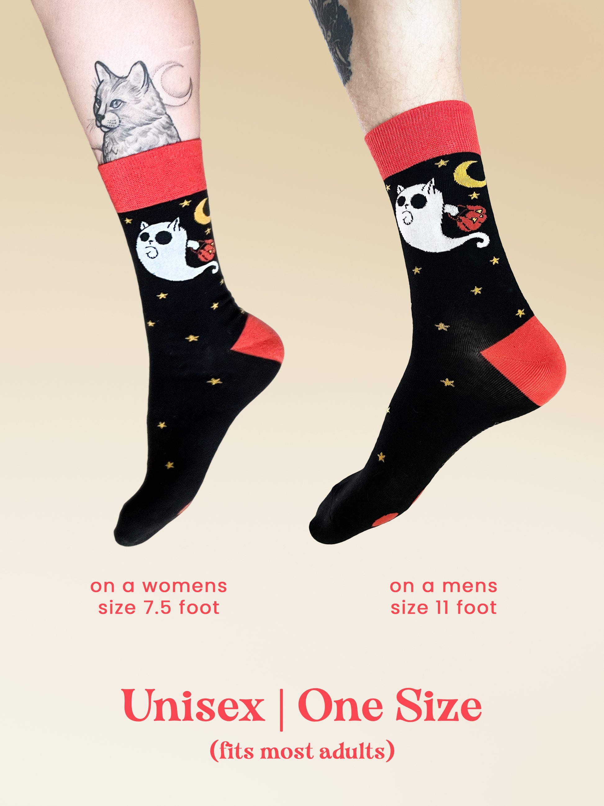 Luna moths and death-head moths dance in the midnight garden on a deep green background, with chartreuse cuff, heel, and toe accents. These socks are so comfy and the ideal height to show off. Perfect for green witches, gardeners, and general snazzy dressers.