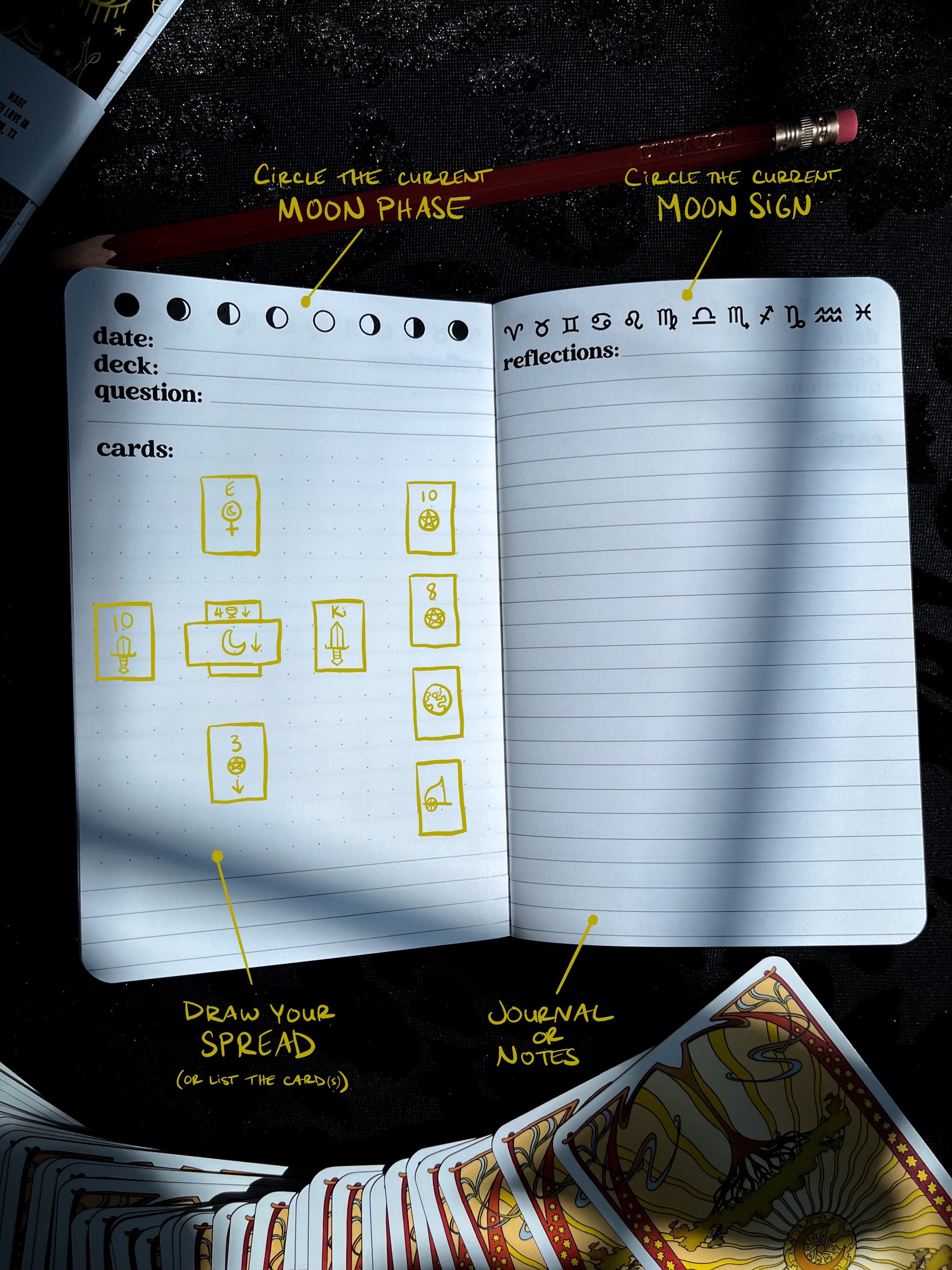 - Lined interior pages with custom fields for tarot note-taking