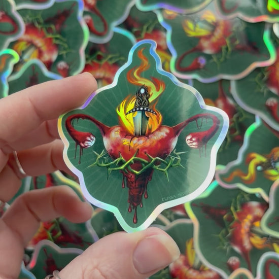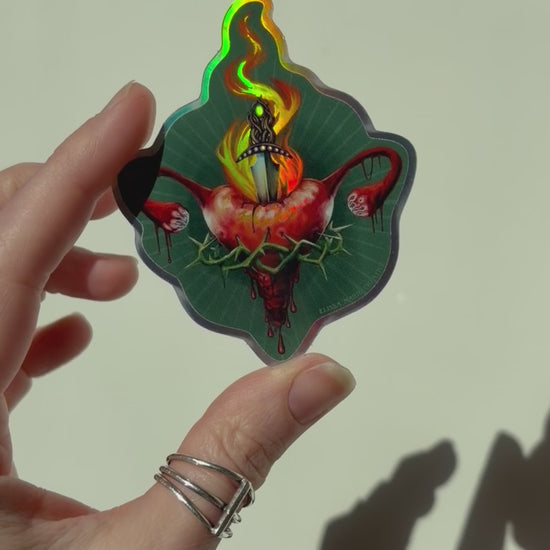 Simultaneously sacred and violent, both powerful and caged, the uterus sits at the heart of the sacral realm. So often wreaking havoc on its bearer, yet symbolizing feminine power and strength. This holographic sticker design features a uterus aflame with glowing ovaries, caged in a ring of thorny vines, and impaled by a lunar athame.