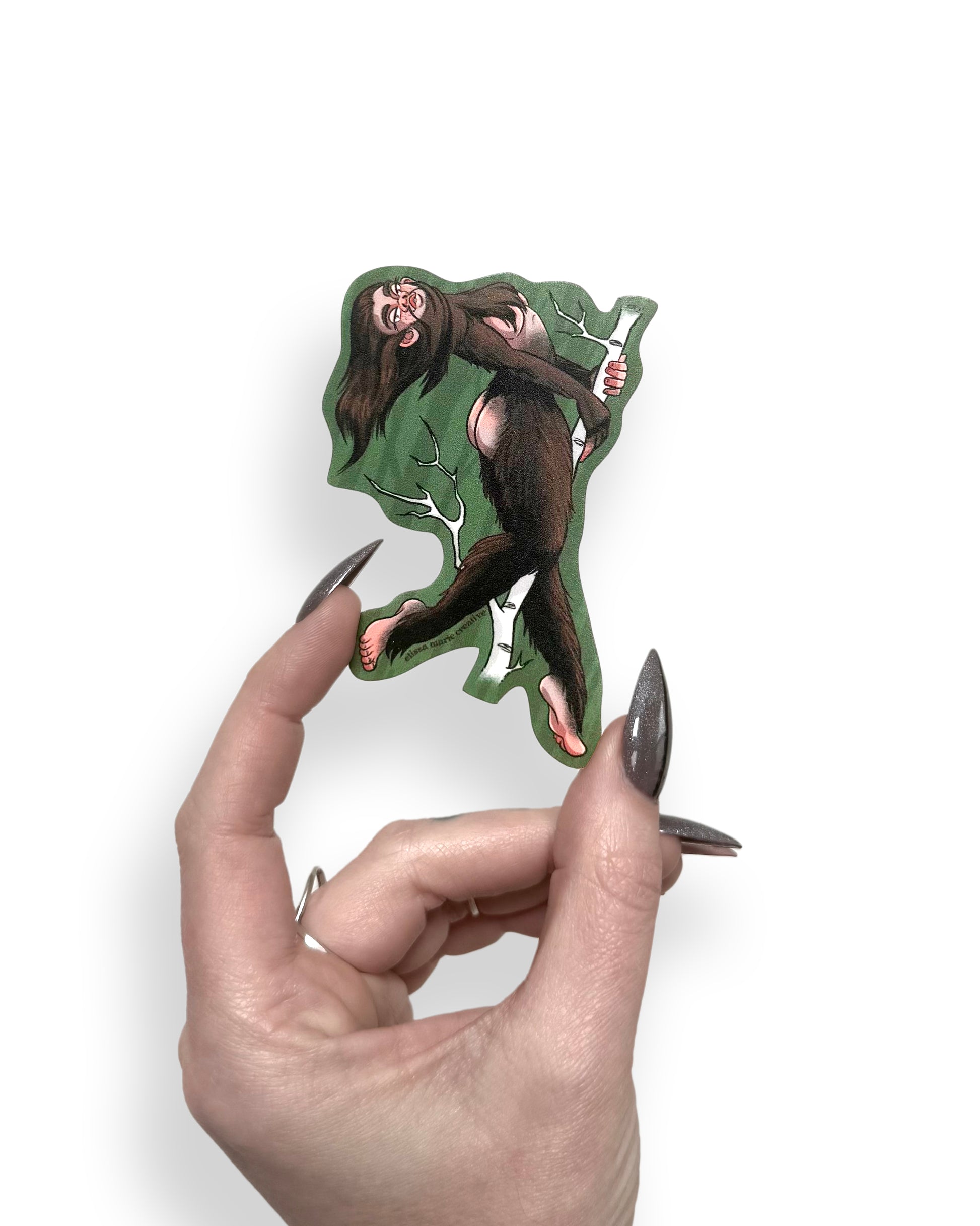 The real reason we can never find Bigfoot? She's too busy practicing her pole sits. Stick this sASSy cryptid on your laptop, your water bottle, your tablet, or wherever you like to stick things. Stickers ship fo' free!